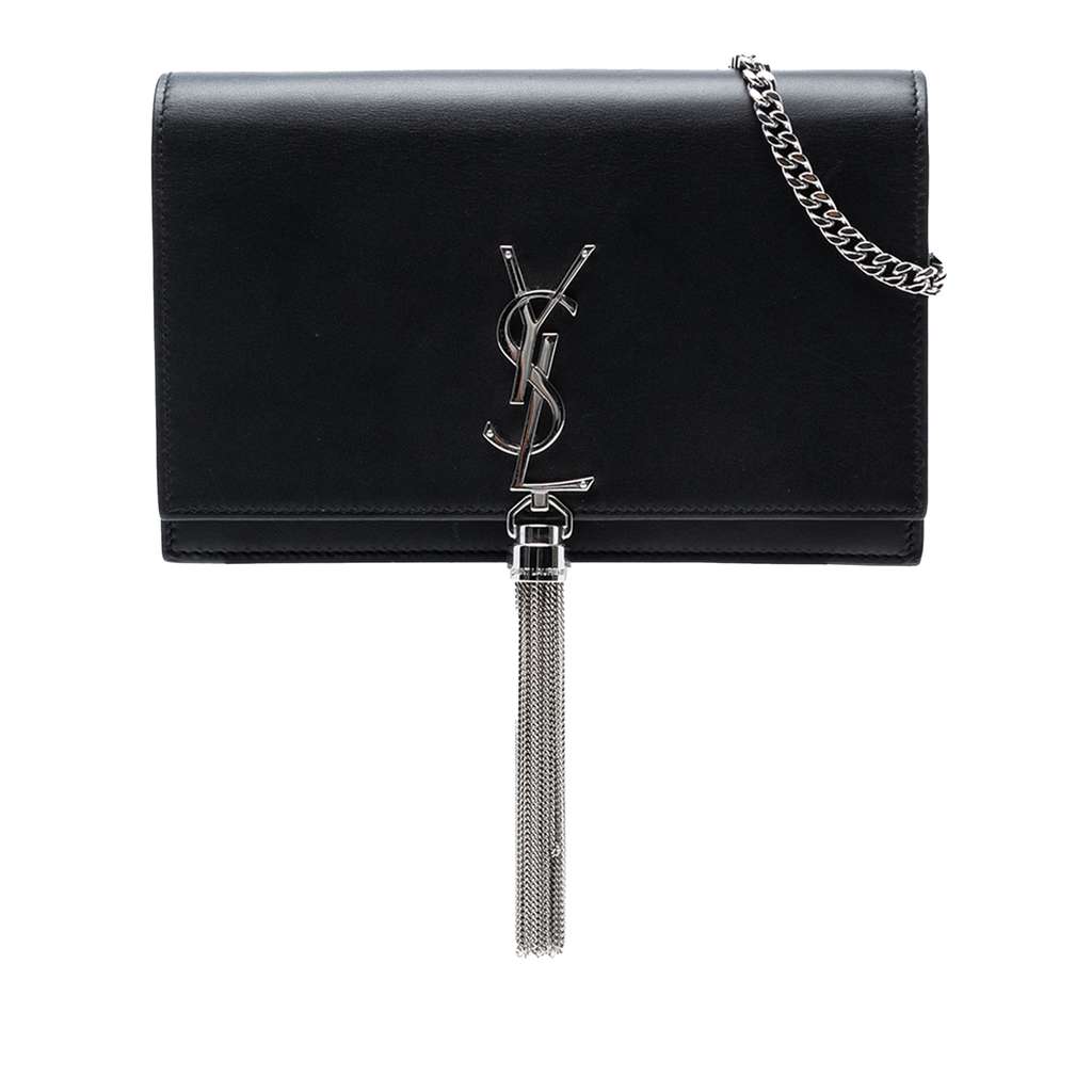 The Kate wallet on chain features a leather body with a tassel, a silver-tone chain-link shoulder strap, a front flap with magnetic snap closure, and interior zip and slip compartments.