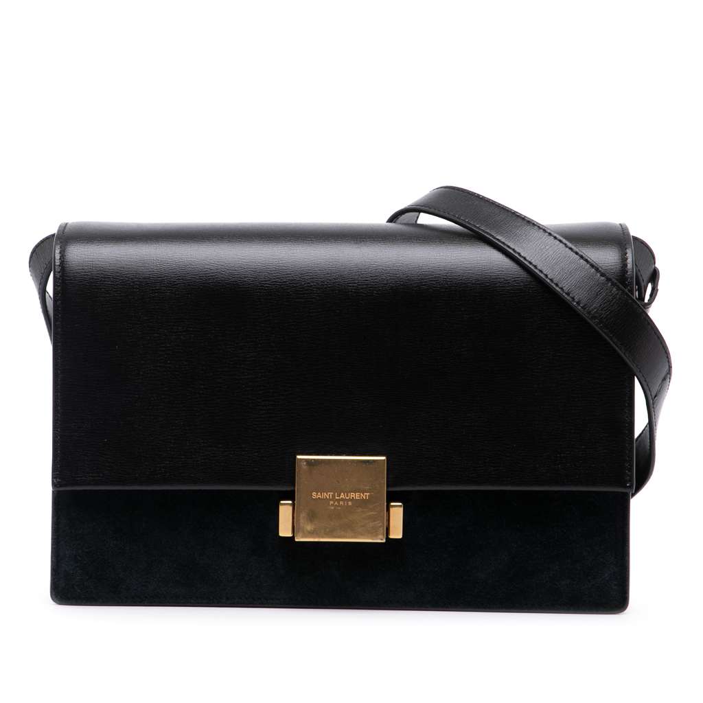 The Bellechasse bag features a leather body with suede panels, an adjustable flat leather shoulder strap, a front flap with magnetic closure, and an interior slip pocket.