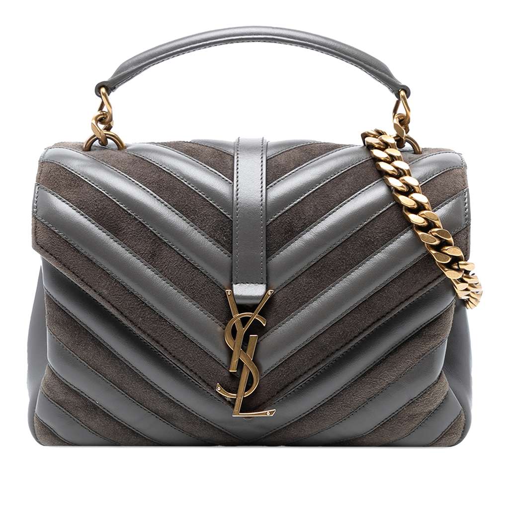 The College satchel features a quilted calfskin and suede body, a rolled leather top handle, a curb chain strap, a front flap with magnetic snap button closure, an exterior slip pocket, and interior zip and slip pockets.