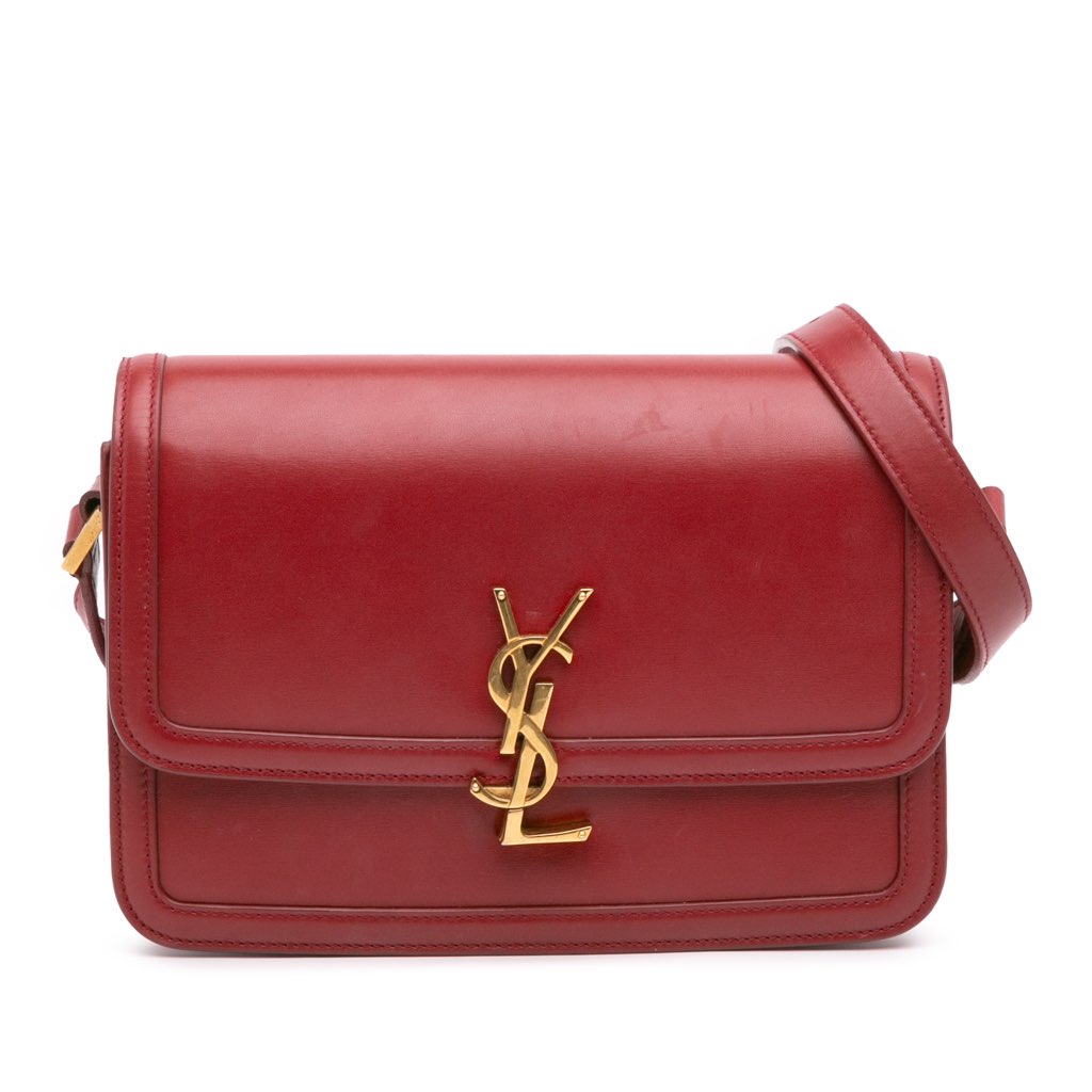 The Solferino features a leather body, an adjustable flat leather strap, a flap with clasp closure, and an interior slip pocket.
