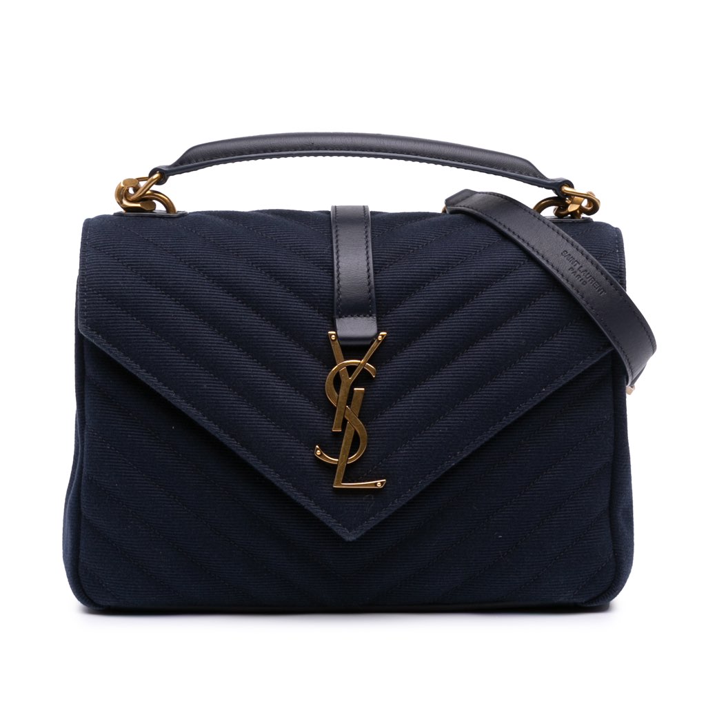 The College satchel features a quilted canvas body, a rolled leather top handle, a curb chain strap, a front flap with magnetic snap button closure, an exterior slip pocket, and interior zip and slip pockets.