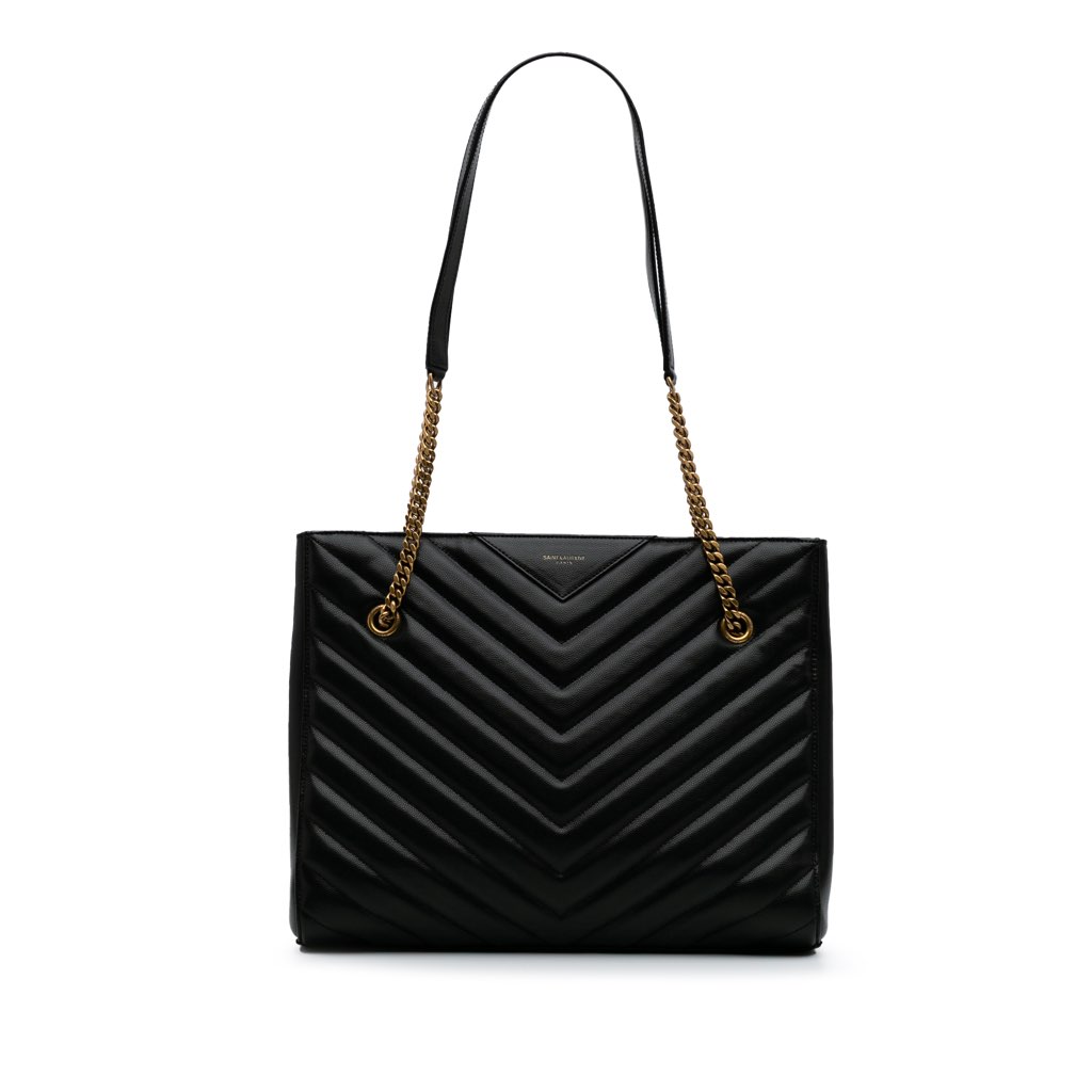 This tote features a quilted leather body, chain-link shoulder straps with leather guards, a top zip closure, dual compartments with top zip closures, and interior zip and slip pockets.