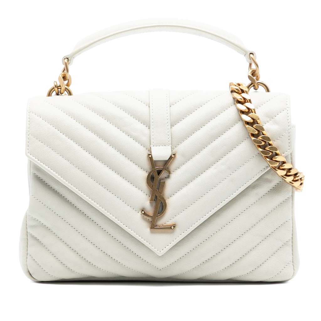 The College satchel features a quilted leather body, a rolled leather top handle, a detachable curb chain shoulder strap with leather guard, a front flap with magnetic snap closure, an interior back slip pocket, and an interior zip pocket. Handle has been repainted.