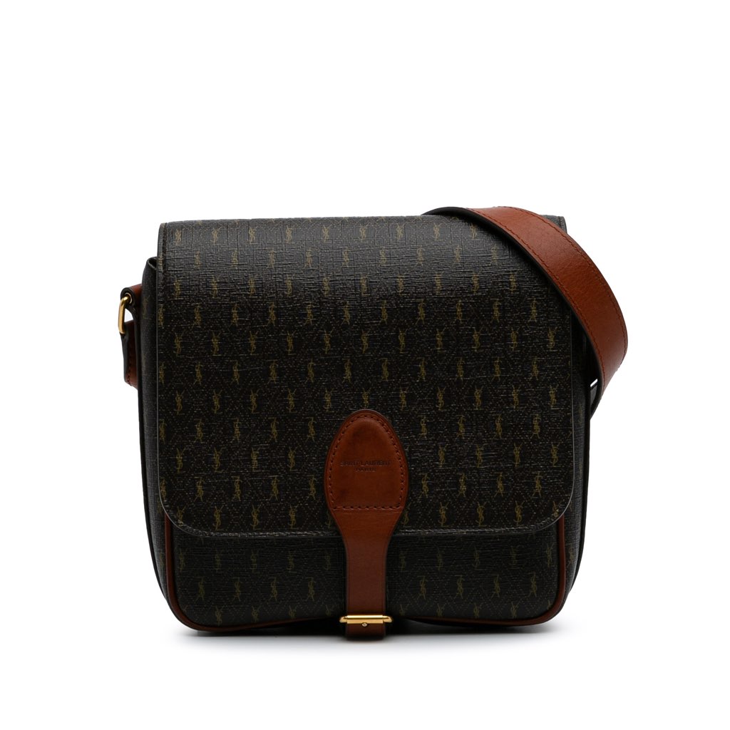 This crossbody features a printed coated canvas with leather trim, an adjustable flat leather shoulder strap, a front flap with buckle closure, and an interior slip pocket.