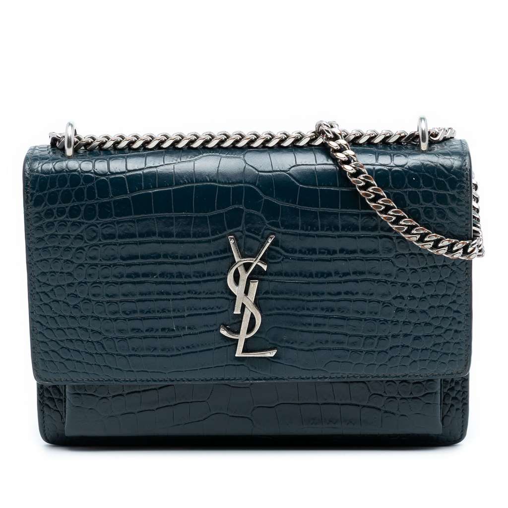 This crossbody bag features an embossed leather body, a curb chain shoulder strap, a front flap with magnetic snap closure, double compartments, and an interior slip pocket.