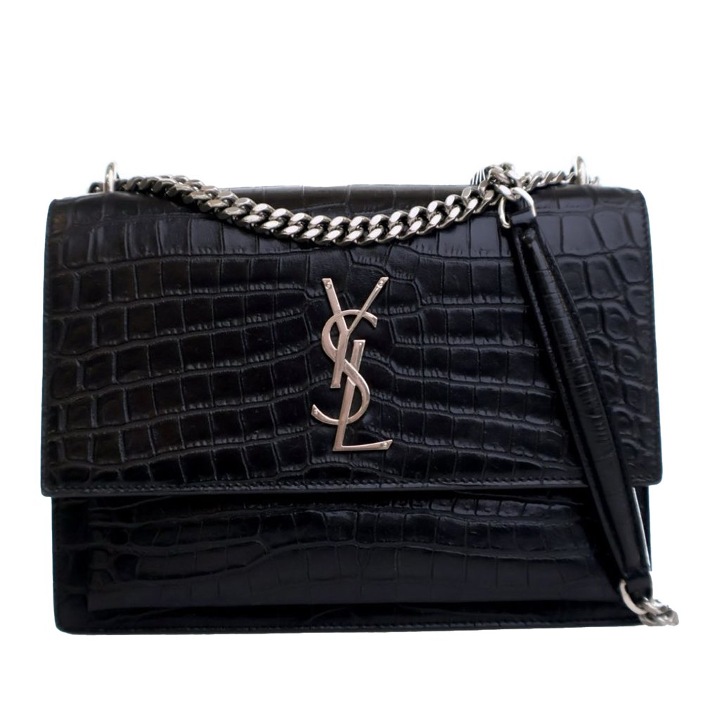 This crossbody bag features an embossed leather body, a curb chain shoulder strap, front flaps with magnetic snap closure, double compartments, and an interior slip pocket.
