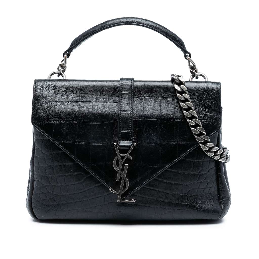 The College features an embossed leather body, a rolled leather top handle, a detachable flat leather strap, a front flap with a magnetic closure, and an interior zip pocket.