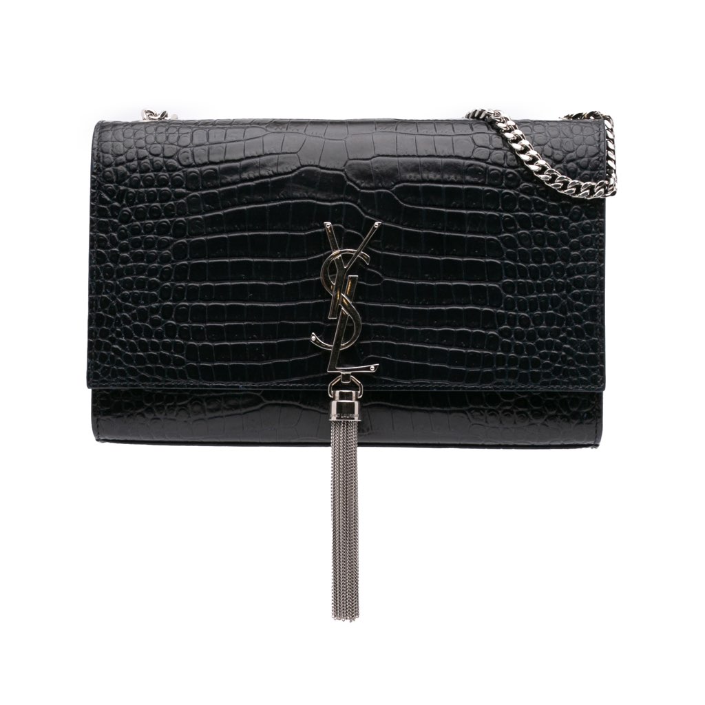 The Kate crossbody bag features an embossed leather body, a chain link shoulder strap, a front flap with magnetic snap closure, and an interior slip pocket.
