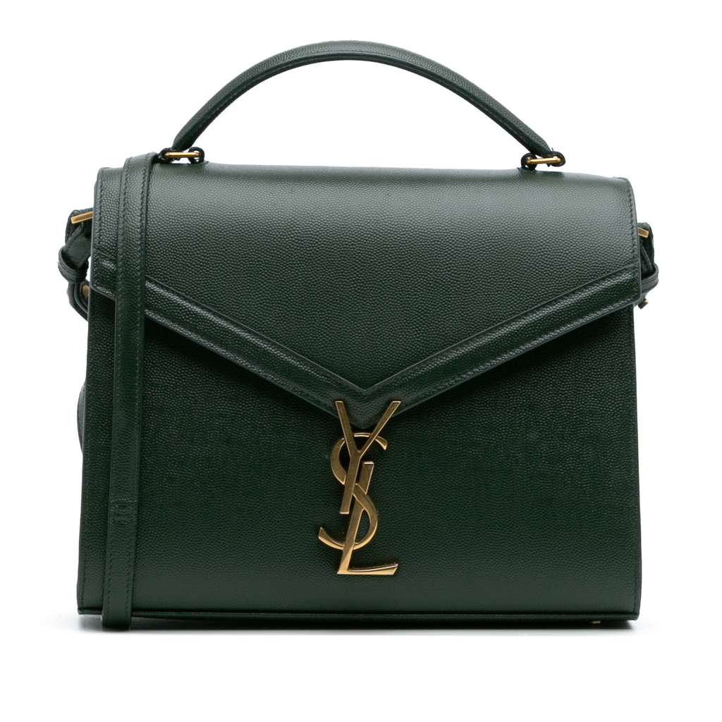The Cassandra features a leather body, a flat leather top handle, a detachable leather shoulder strap, a front flap with metal YSL logo and magnetic snap closure, exterior back slip pocket, and interior slip pocket.
