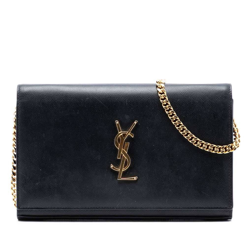 The Kate crossbody bag features a leather body, a gold-tone chain link shoulder strap, a front flap with a metal YSL logo and magnetic snap closure, and an interior slip pocket.