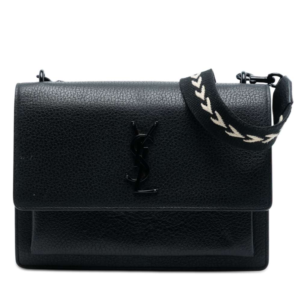 The Sunset features a leather body, a flat canvas strap, a top flap with magnetic snap button closure, an exterior front open pocket, two interior compartments, and an interior slip pocket.
