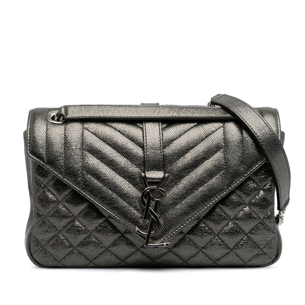 This shoulder bag features a quilted leather body, chain link shoulder straps with leather guard, a front flap with magnetic snap closure, and an interior slip pocket.