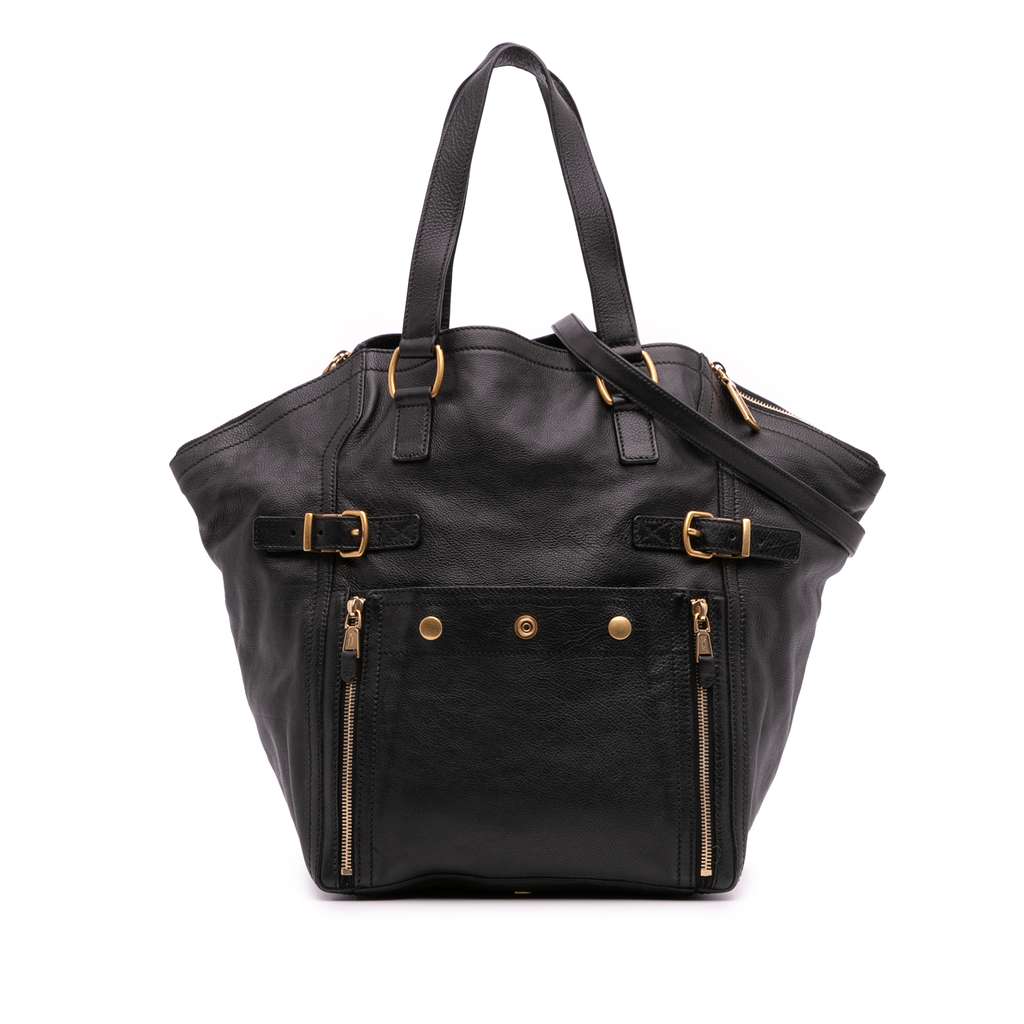 The Downtown features a leather body, flat leather straps, a detachable strap, an open top with zip expansions, an exterior front snap button pocket with zip details, and an interior zip pocket.