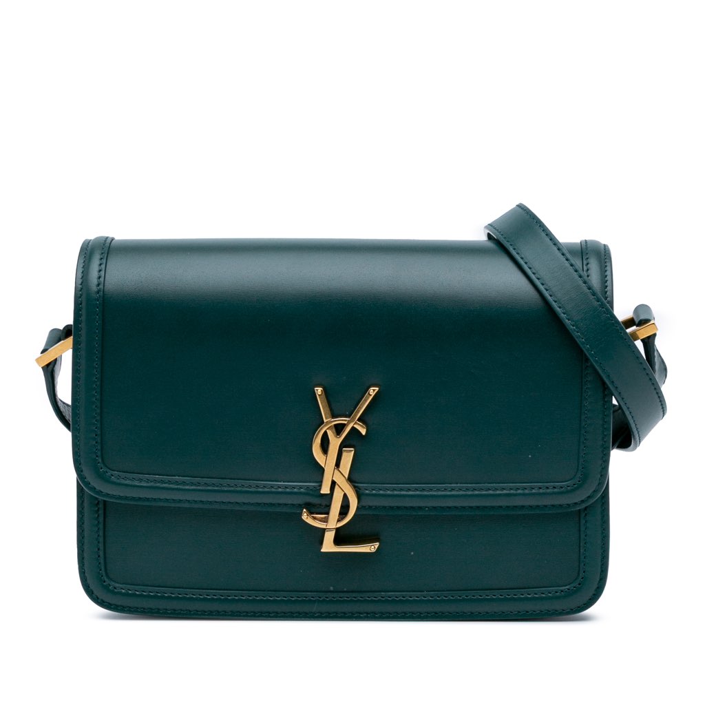 The Solferino features a leather body, an adjustable flat leather strap, a flap with clasp closure, and an interior slip pocket.