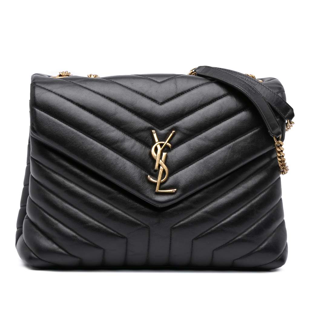 The LouLou features a quilted leather body, curb chain straps with leather guard, a front flap with a magnetic snap button closure, an interior center zip compartment, and interior zip and slip pockets.