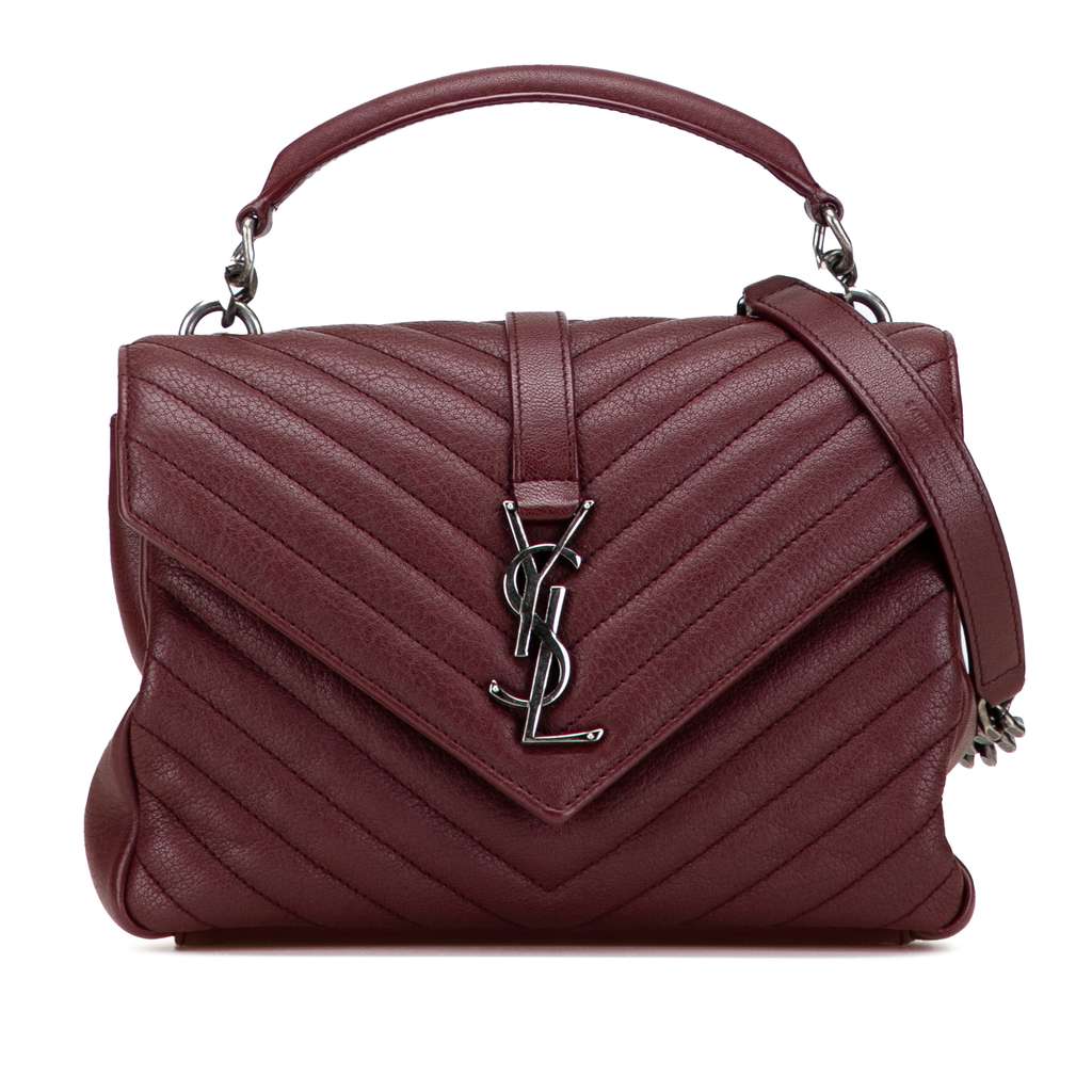 The College satchel features a quilted leather body, a rolled leather top handle, a detachable curb chain shoulder strap with leather guard, a front flap with magnetic snap closure, an interior back slip pocket, and an interior zip pocket.