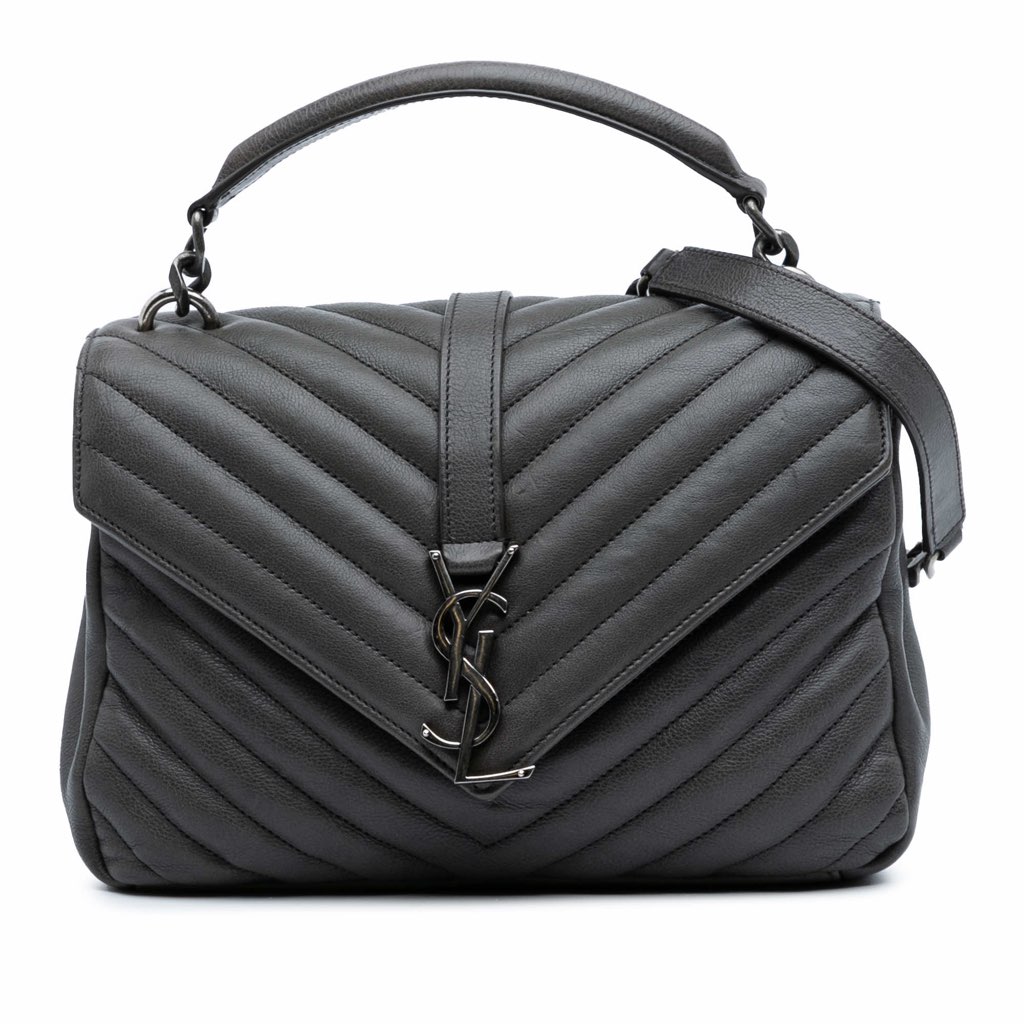 The College Satchel features a chevron quilted sheepskin leather body, a rolled leather top handle, a curb chain strap, a front flap with magnetic closure, an exterior slip pocket, and interior zip and slip pockets.