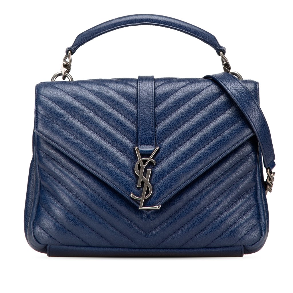 The College satchel features a quilted leather body, a flat leather top handle, a detachable chain link strap with leather guard, a front flap with magnetic closure, an exterior back slip pocket, and an interior zip pocket.