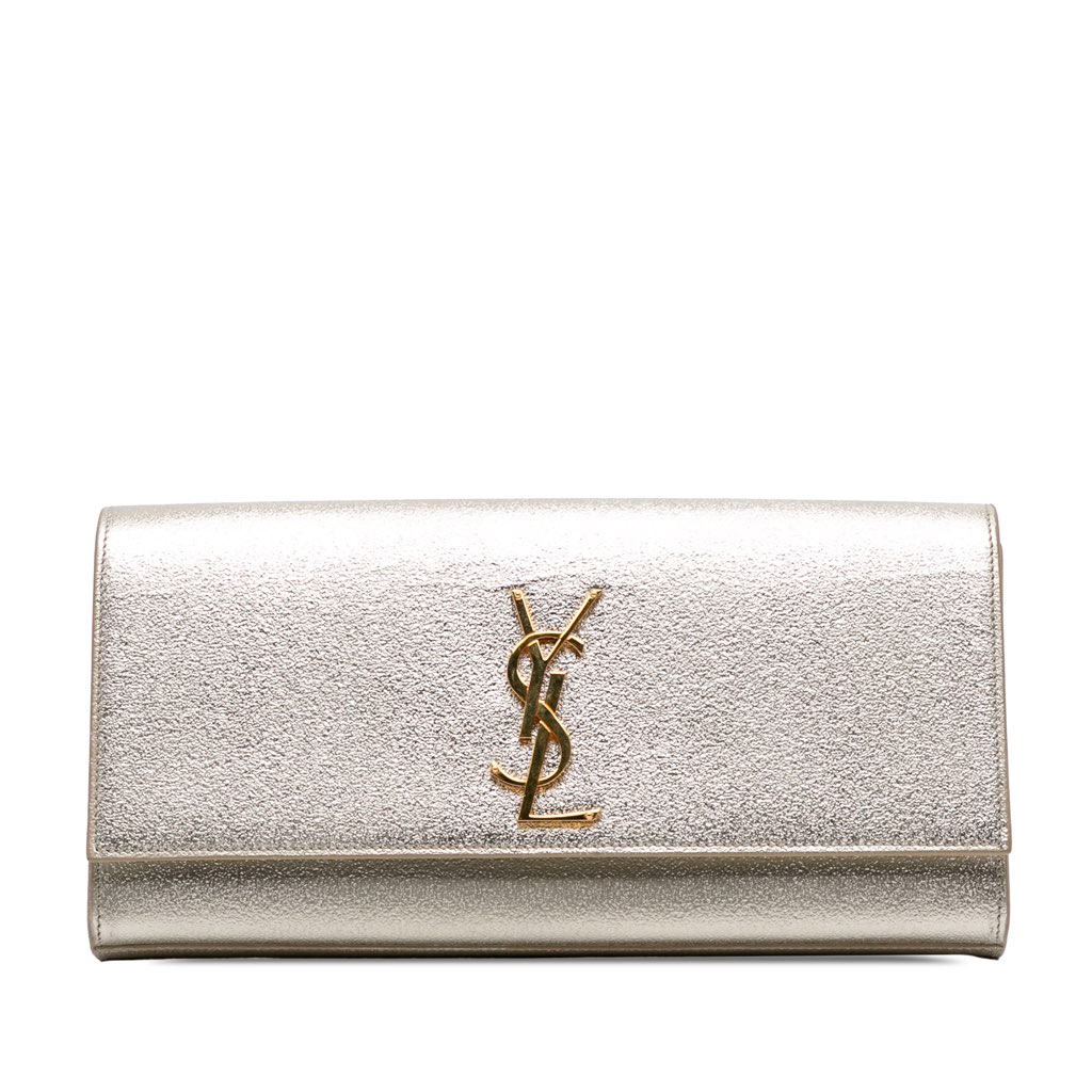This clutch bag features a metallic leather body, a front flap with magnetic closure, and an interior slip pocket.