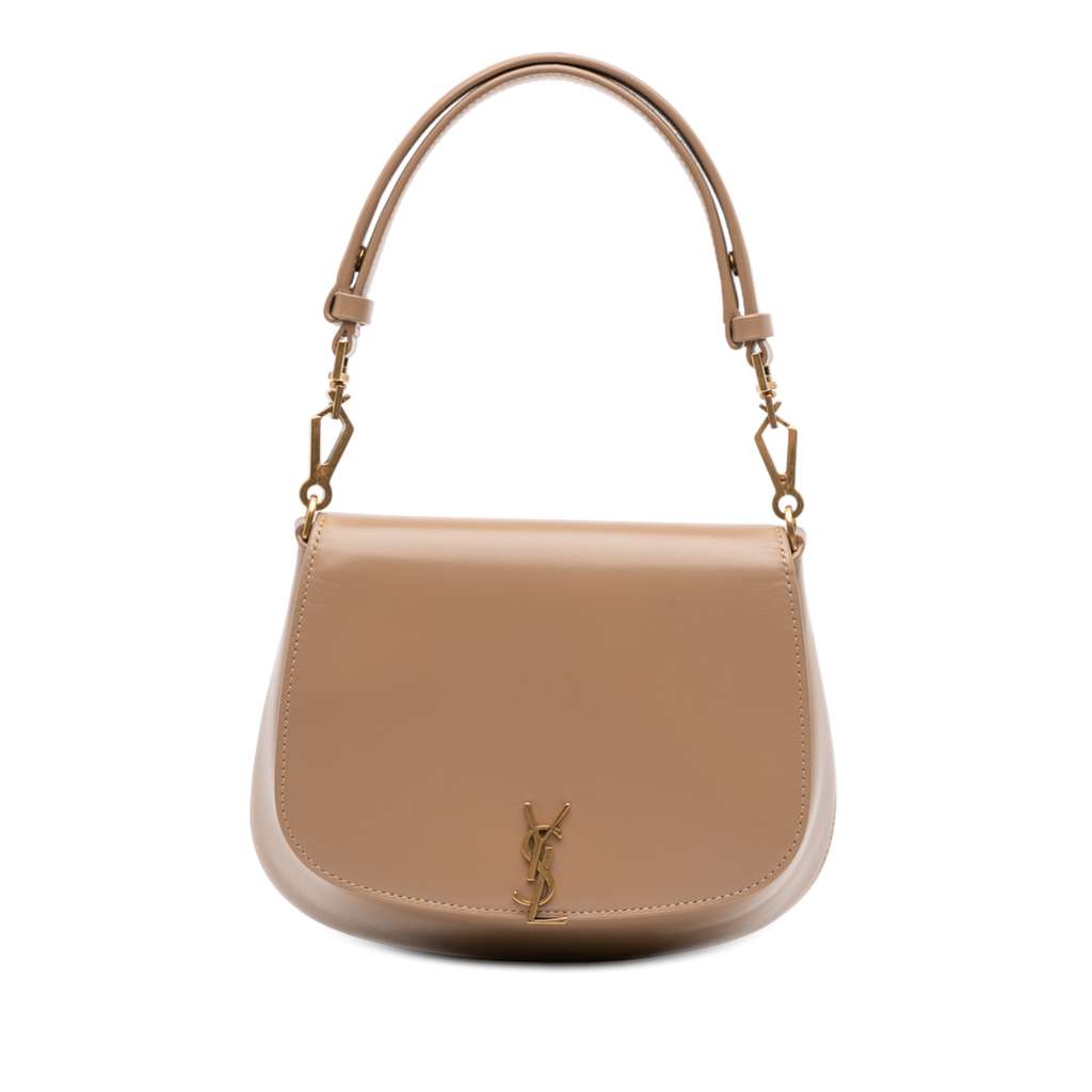 The Voltaire Top Handle bag features a leather body, an adjustable flat leather strap, a front flap with magnetic snap closure, and an interior slip pocket.