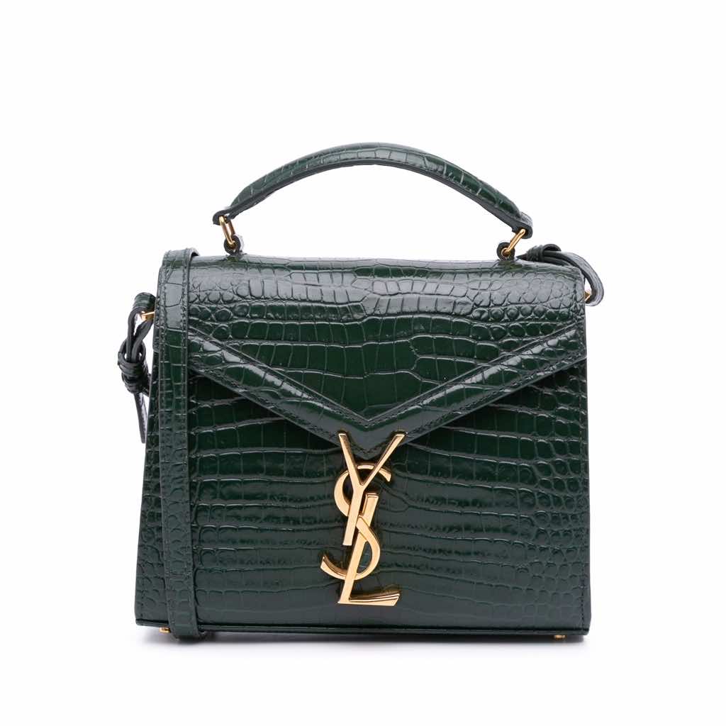 The Cassandra features an embossed leather body, a flat leather top handle, a detachable leather strap, a front flap with a metal YSL logo and magnetic closure, and an interior slip pocket.