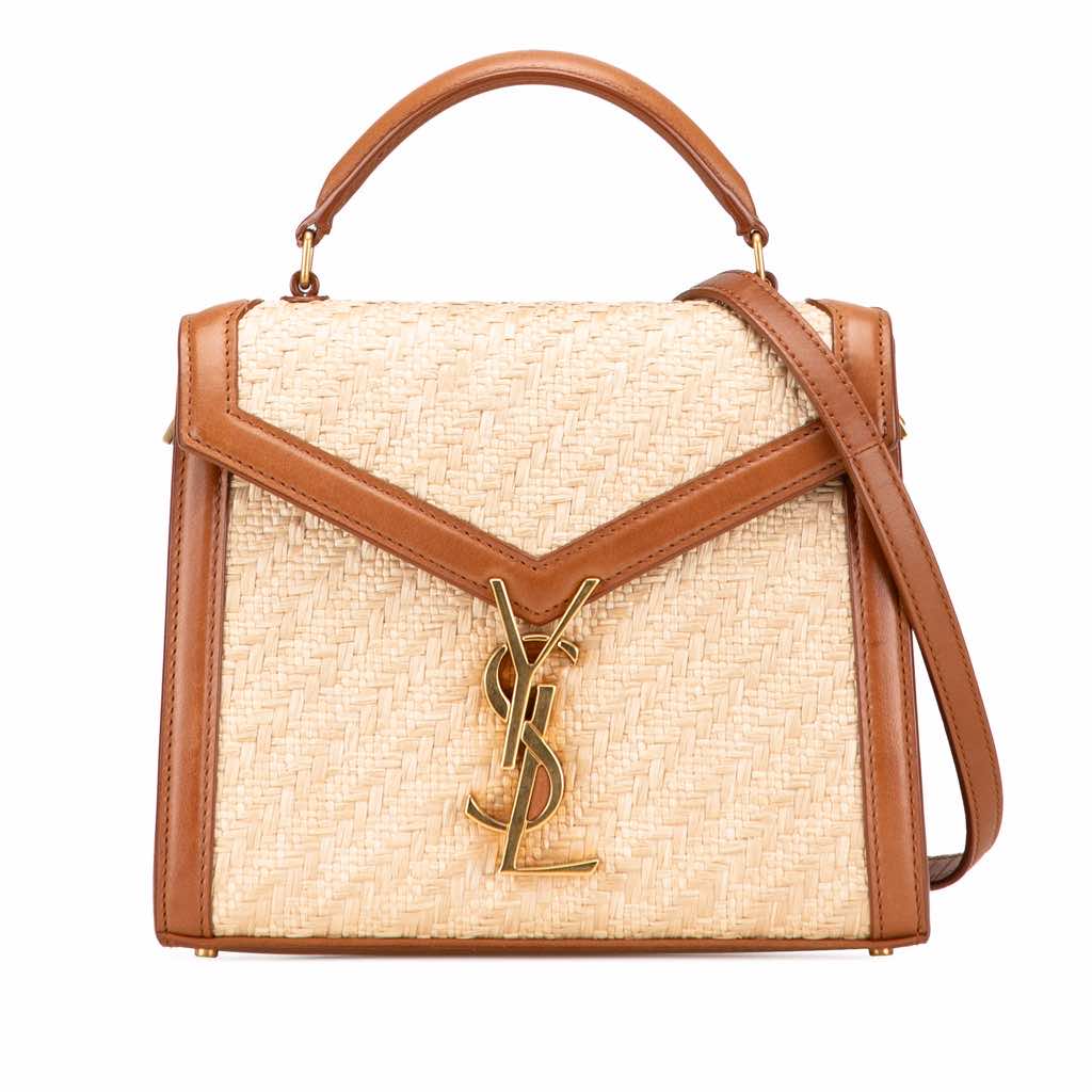 The Cassandra features a raffia body with leather trim, a flat leather handle, a detachable leather strap, a front flap with metal YSL logo and magnetic closure, and an interior slip pocket.