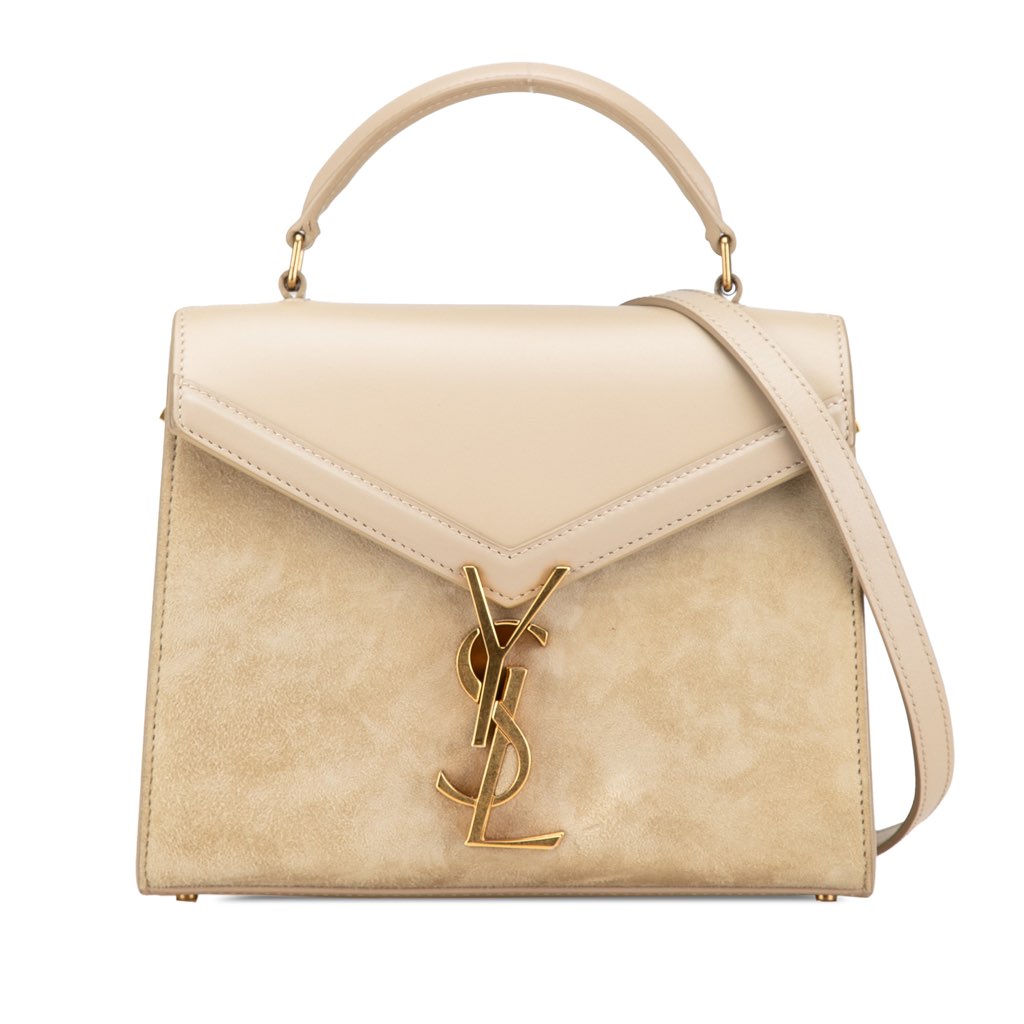 The Cassandra features a suede leather body, a flat leather handle, a detachable leather strap, a front flap with a metal YSL logo pivoting closure, interior open compartments, an exterior back slip pocket, and an interior slip pocket.