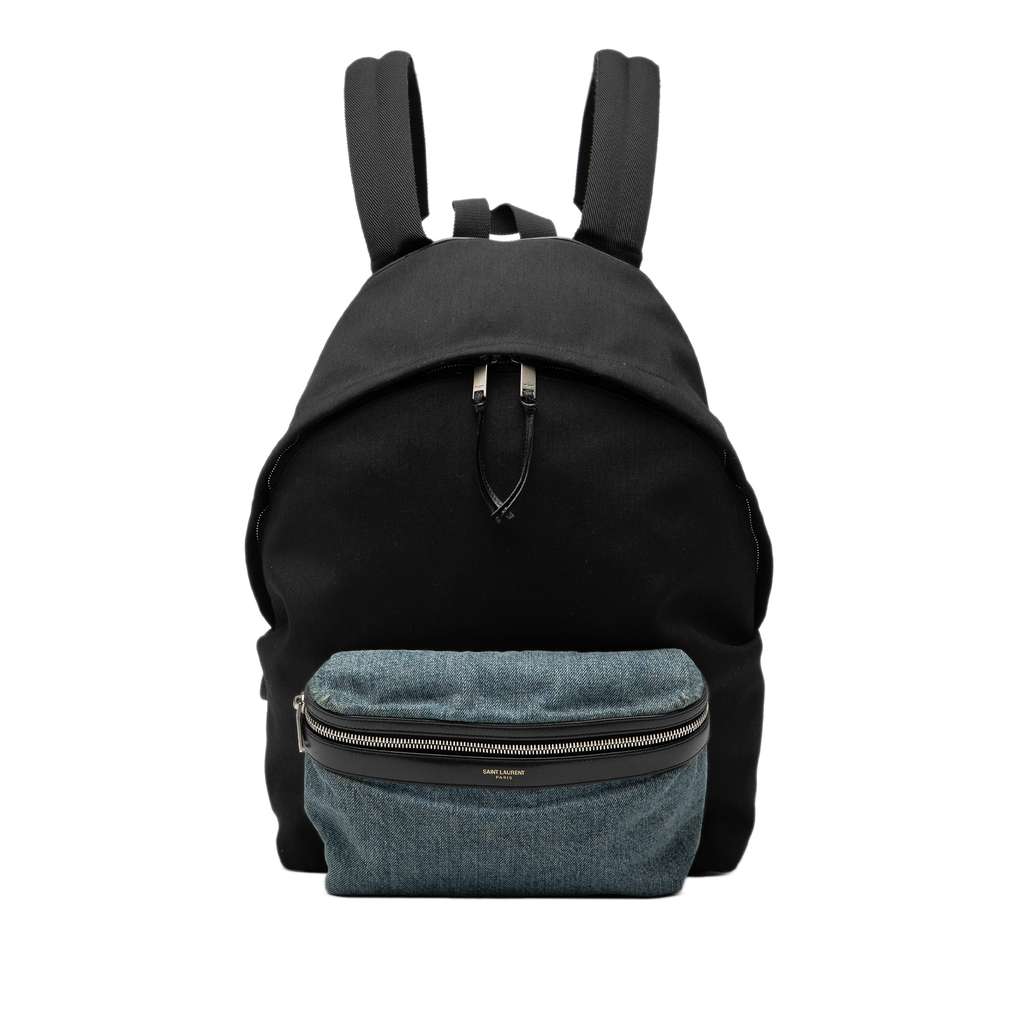 This backpack features a nylon body with leather trim, a flat top handle, adjustable back straps, a top zip closure, an exterior front denim zip pocket, and an interior zip pocket.