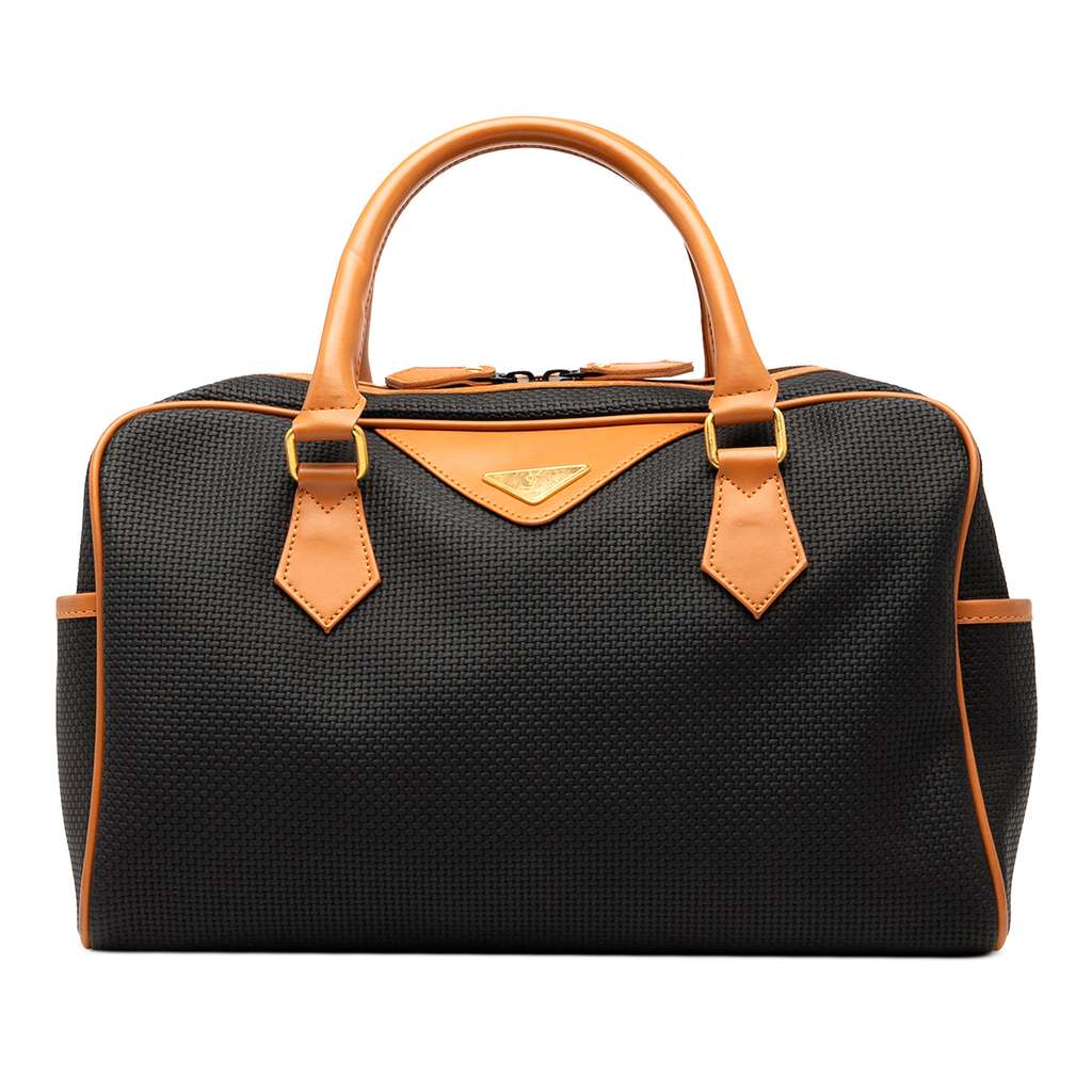 This boston bag features a PVC body with leather trim, rolled leather handles, a top zip closure, exterior side slip pockets, and an interior zip pocket.