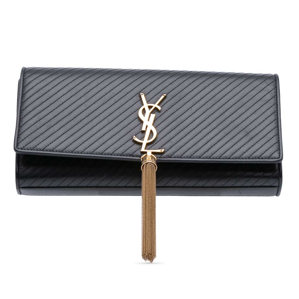 This clutch bag features a calfskin leather body, a front flap with magnetic snap closure, and an interior slip pocket.