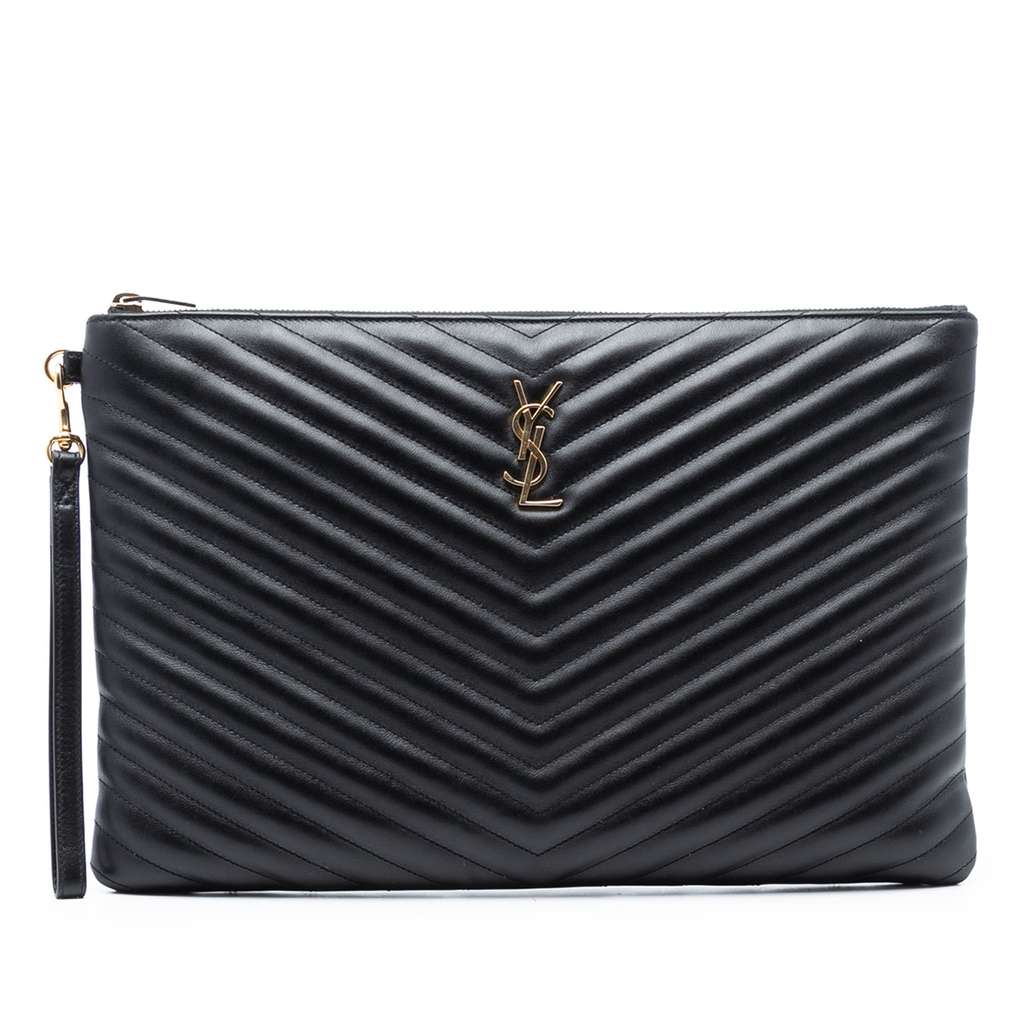 This clutch bag features a quilted leather body, flat wrist strap, a top zip closure and interior slip pockets.