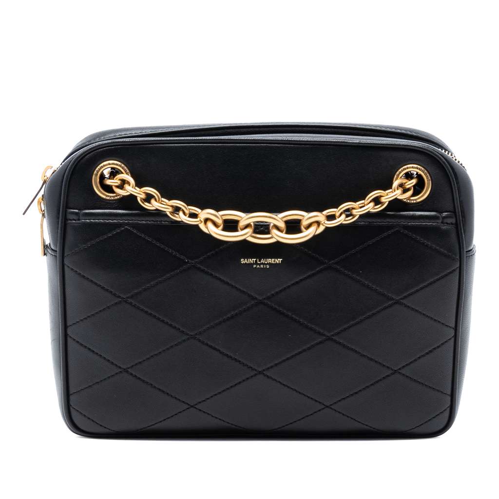 The Le Maillon features a quilted lambskin body, chain strap with leather guard, a top zip closure, an exterior front slip compartment, and an interior zip pocket.