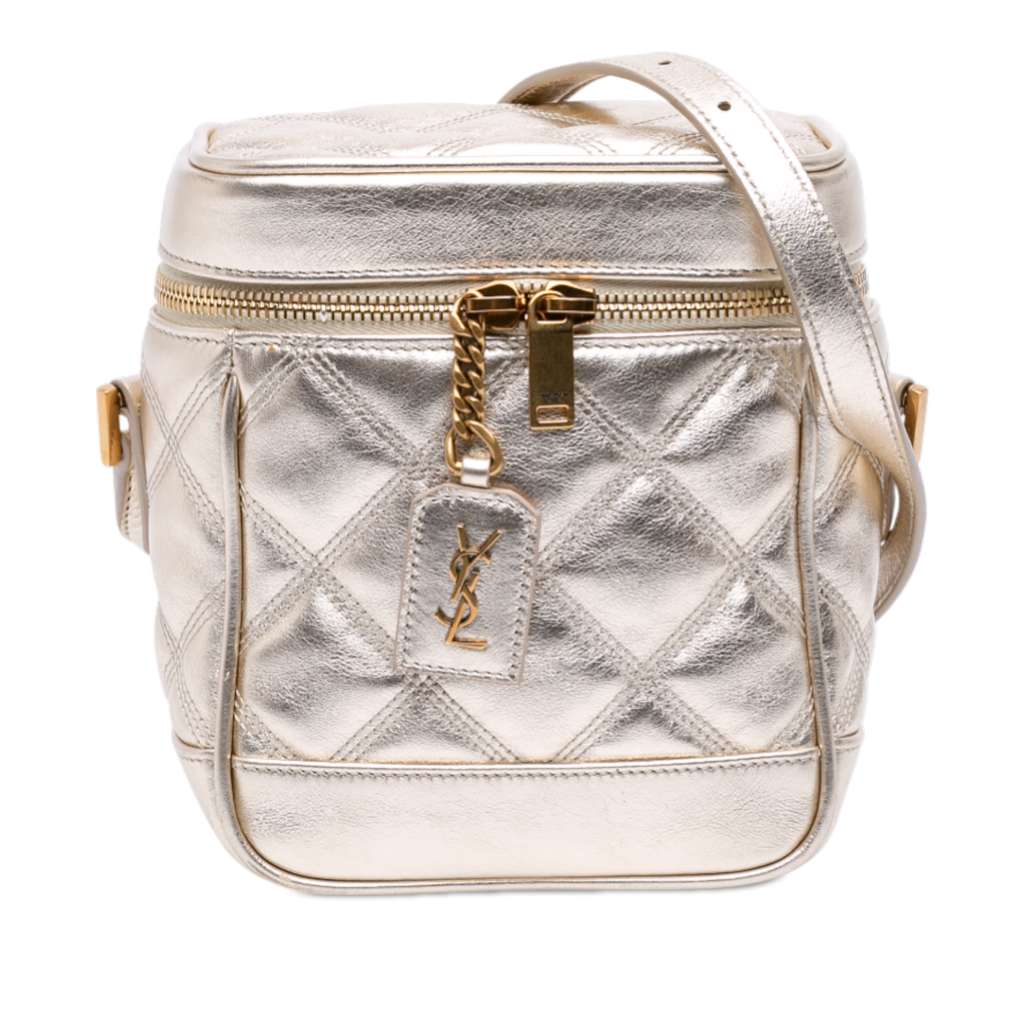 This vanity bag features a quilted leather body, a chain link and adjustable flat leather strap, a top zip around closure, and an interior slip pocket.