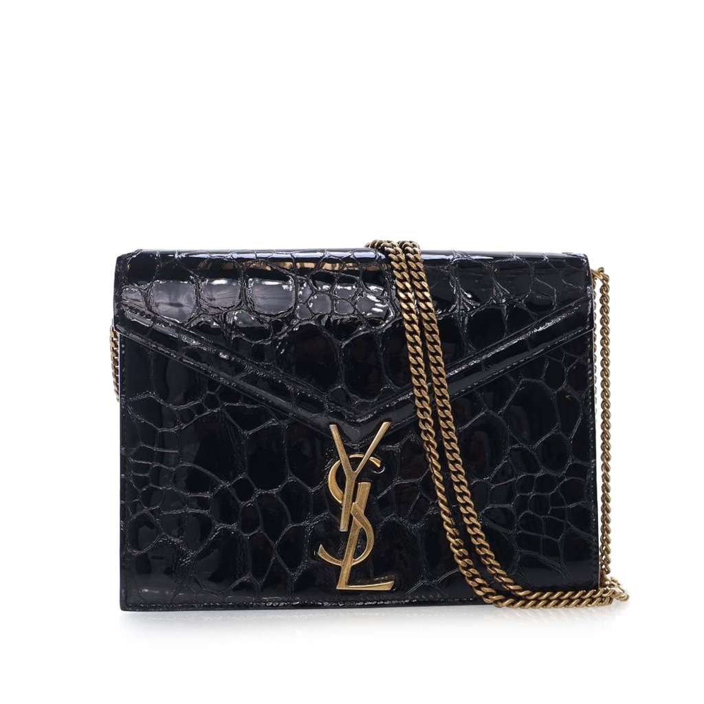 The Cassandra features a suede and calf leather body, a gold-tone chain strap, front flap with metal YSL logo and magnetic closure, and an interior zip pocket.