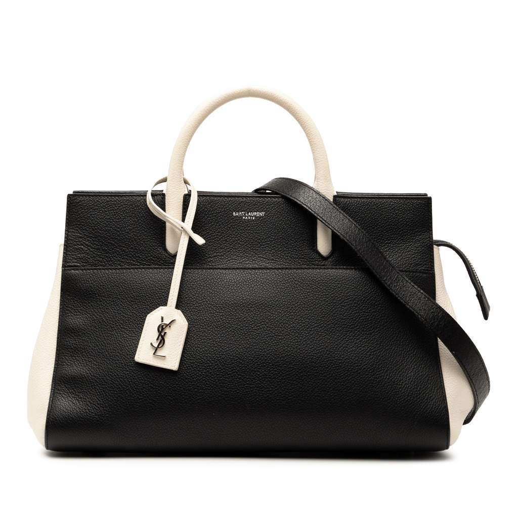 The Rive Gauche Cabas satchel features a leather body, rolled leather handles, a detachable strap, a top zip closure, and interior zip and slip pockets.
