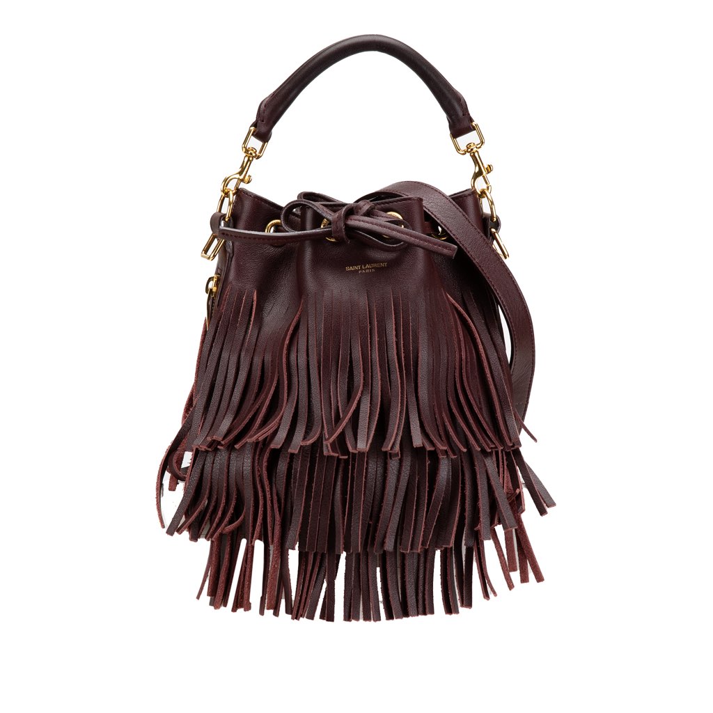 The Emmanuelle features a leather body with fringe details, a detachable rolled leather top handle, an adjustable shoulder strap, and an open top with drawstring closure.