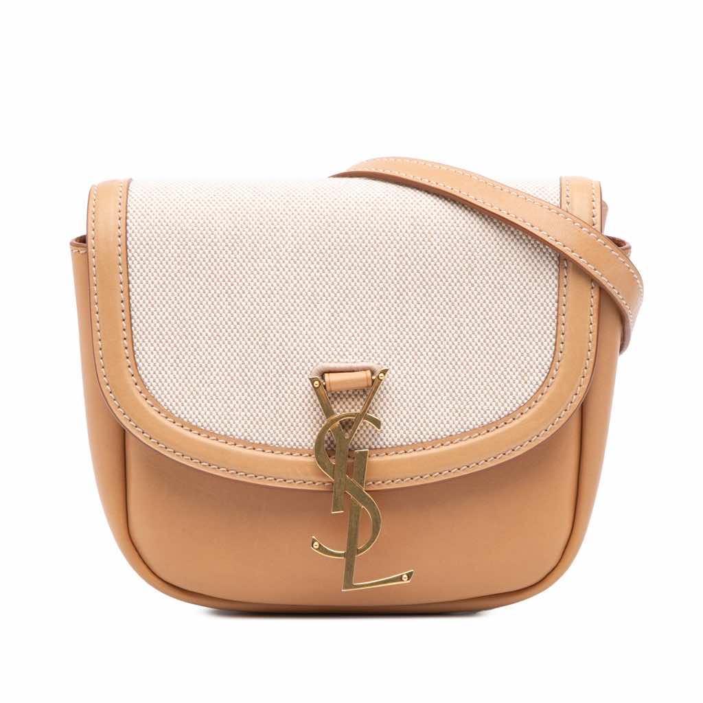 The Kaia features a leather body, an adjustable flat leather strap, a canvas front flap with metal YSL logo and magnetic snap button closure, and an interior slip pocket.