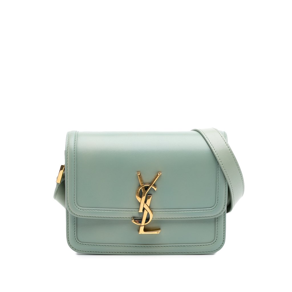 The Solferino features a leather body, an adjustable flat leather strap, a flap with clasp closure, and an interior slip pocket.
