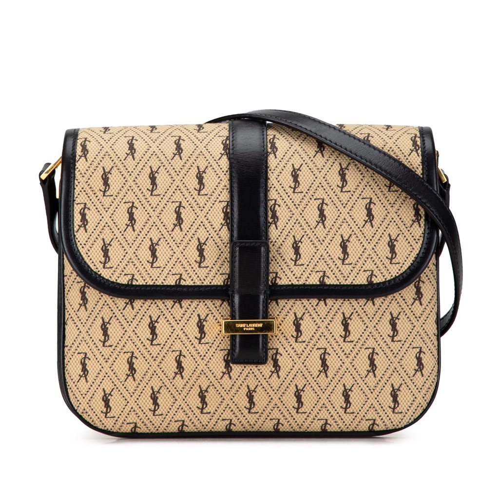 The crossbody bag features a fabric canvas body with leather trim, an adjustable leather strap, a rear pocket, a front flap closure and an interior slip pocket.
