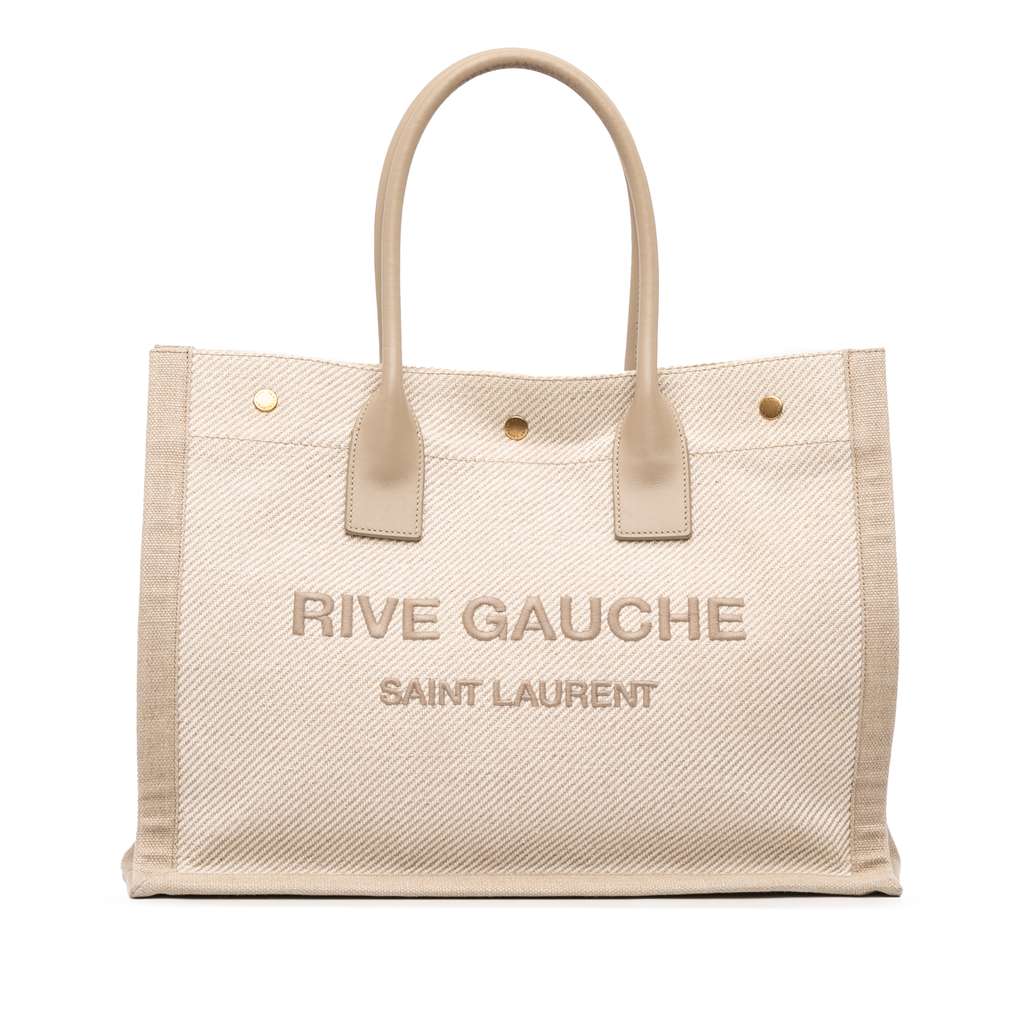 The Rive Gauche features a canvas body, rolled leather handles, a top snap button closures, and an interior zip pocket.