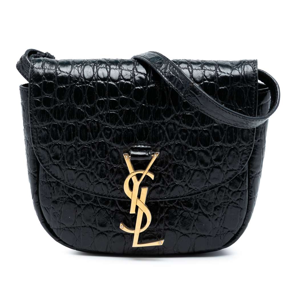 The Kaia features an embossed leather body, an adjustable flat leather strap, a front flap with metal YSL logo and magnetic snap button closure, and an interior slip pocket.