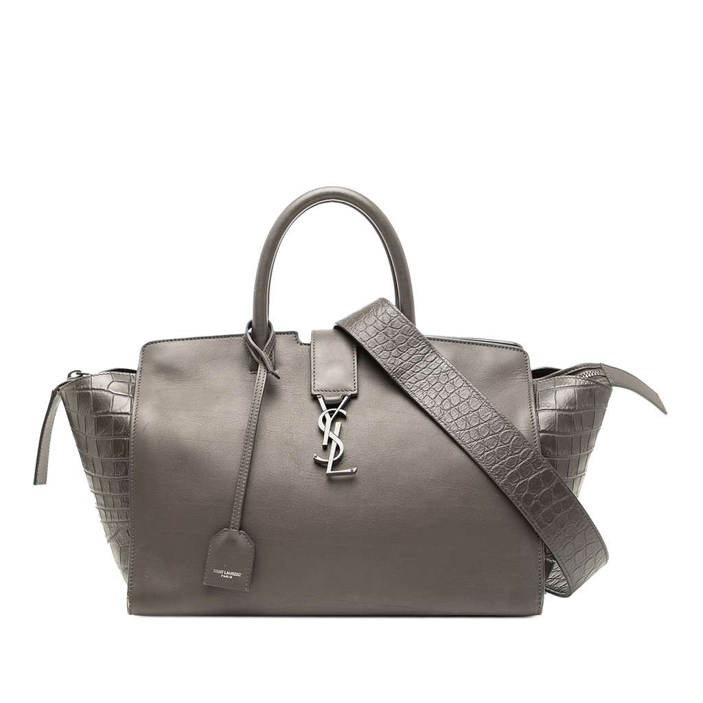 The Downtown Cabas features a leather body, rolled leather handles, a detachable flat leather strap, a top strap with magnetic snap closure, a top zip closure, and an interior slip pocket.