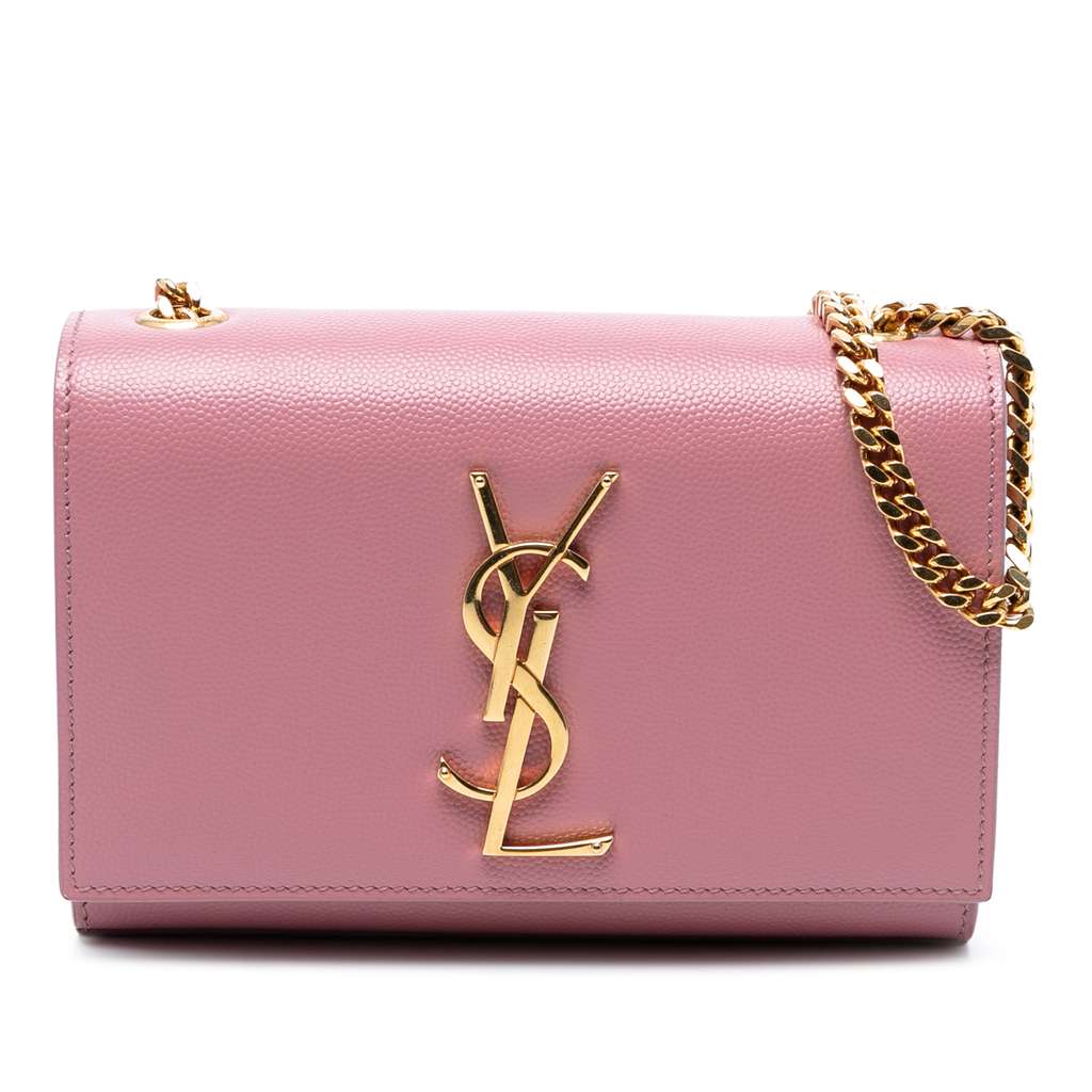 The Kate crossbody bag features a leather body, a gold-tone chain link shoulder strap, a front flap with a metal YSL logo and magnetic closure, and an interior slip pocket.