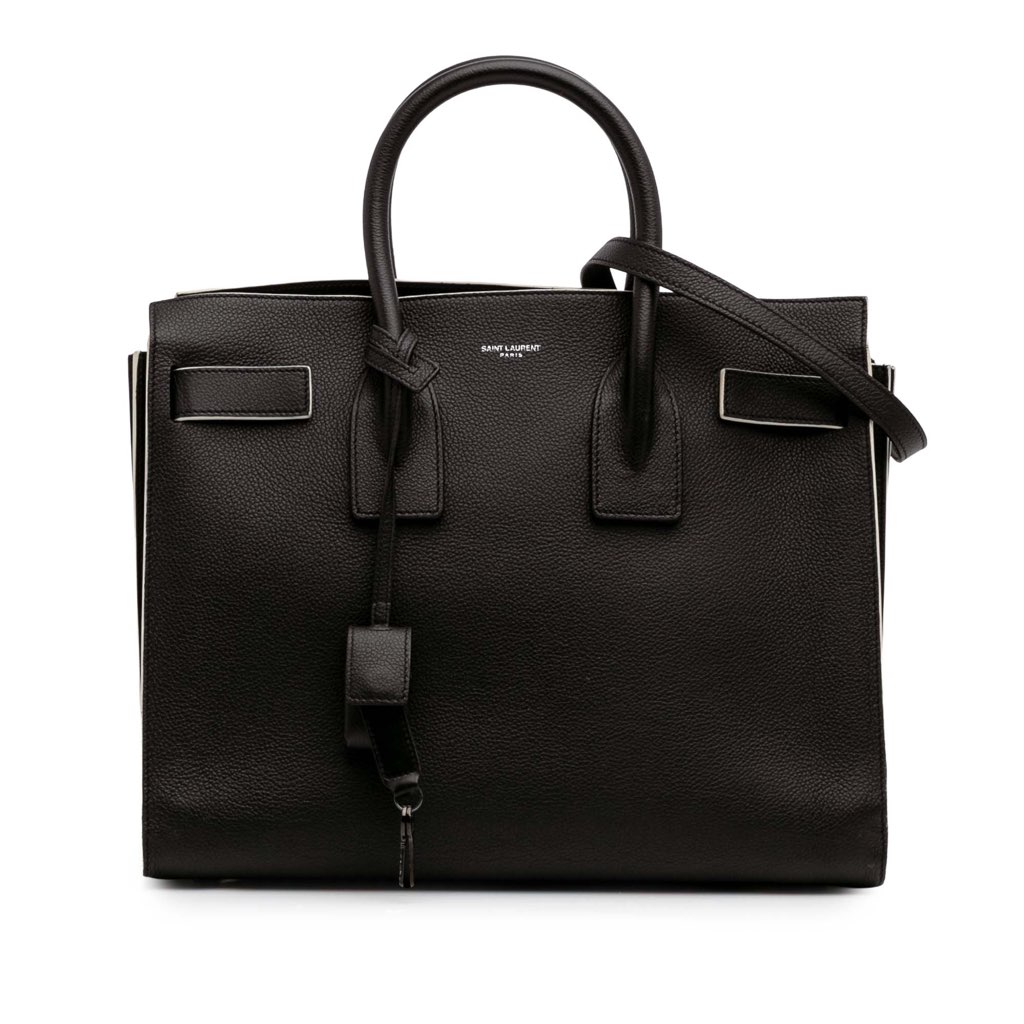 The Sac de Jour features a leather body, rolled leather handles, a detachable flat leather shoulder strap, an open top, and a zip pouch.