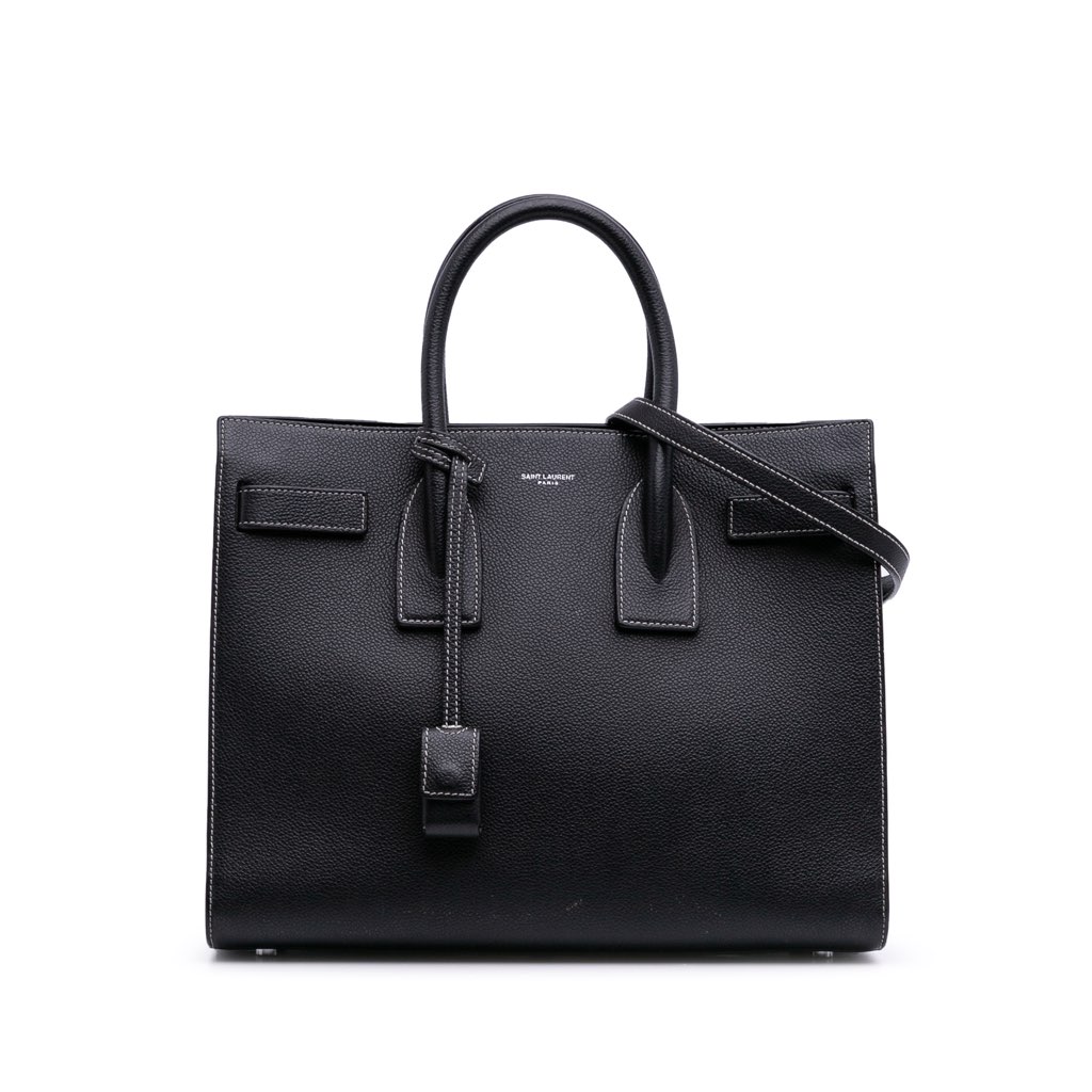 The Sac De Jour features a leather body, rolled leather handles, a detachable flat strap, an open top, an interior zip compartment, and interior zip and slip pockets.