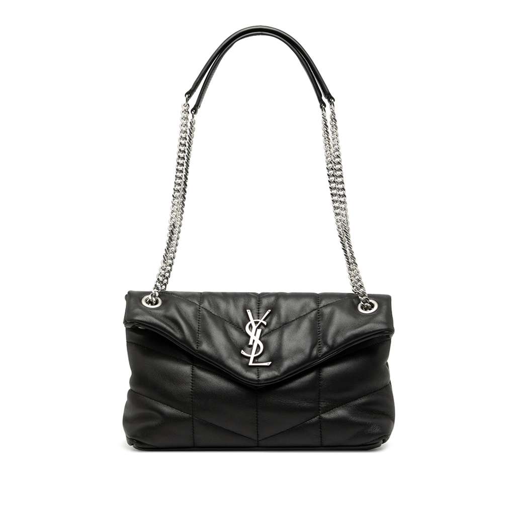 The LouLou Puffer features a quilted lambskin leather body, chain link straps with leather guard, a front flap with magnetic snap closure, and an interior zip pocket.