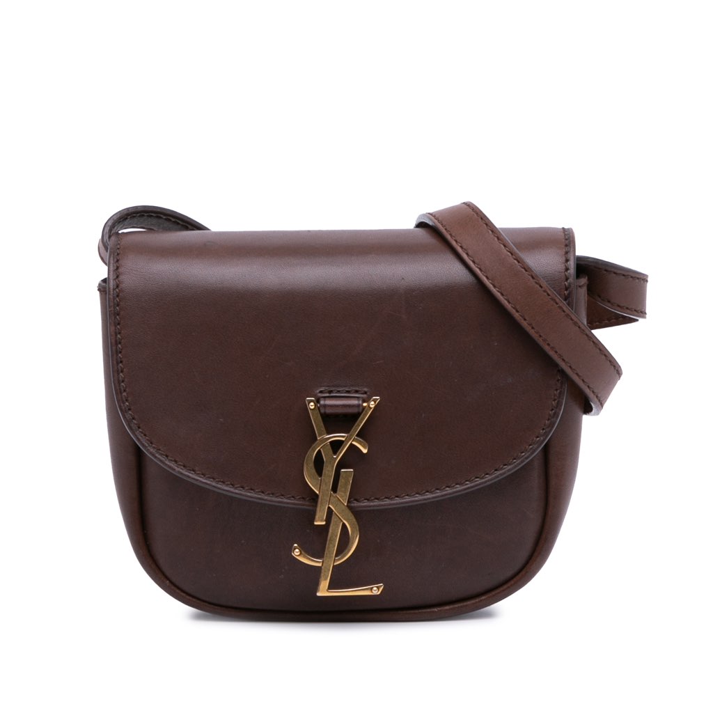 The Kaia features a leather body, an adjustable flat leather strap, a front flap with metal YSL logo and magnetic snap button closure, and an interior slip pocket.