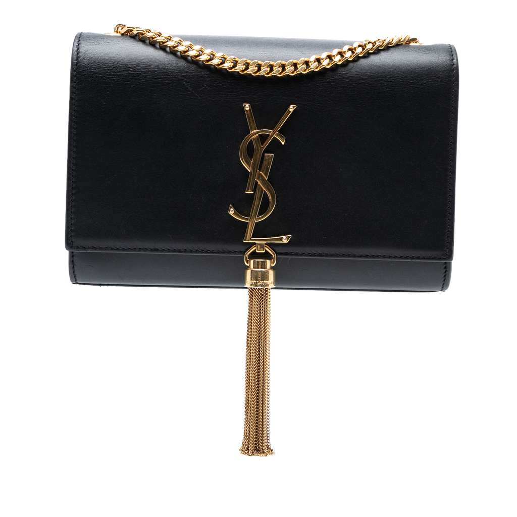 The Kate features a leather body with a tassel detail, a gold-tone chain-link shoulder strap, a front flap with magnetic snap closure, and an interior slip pocket.
