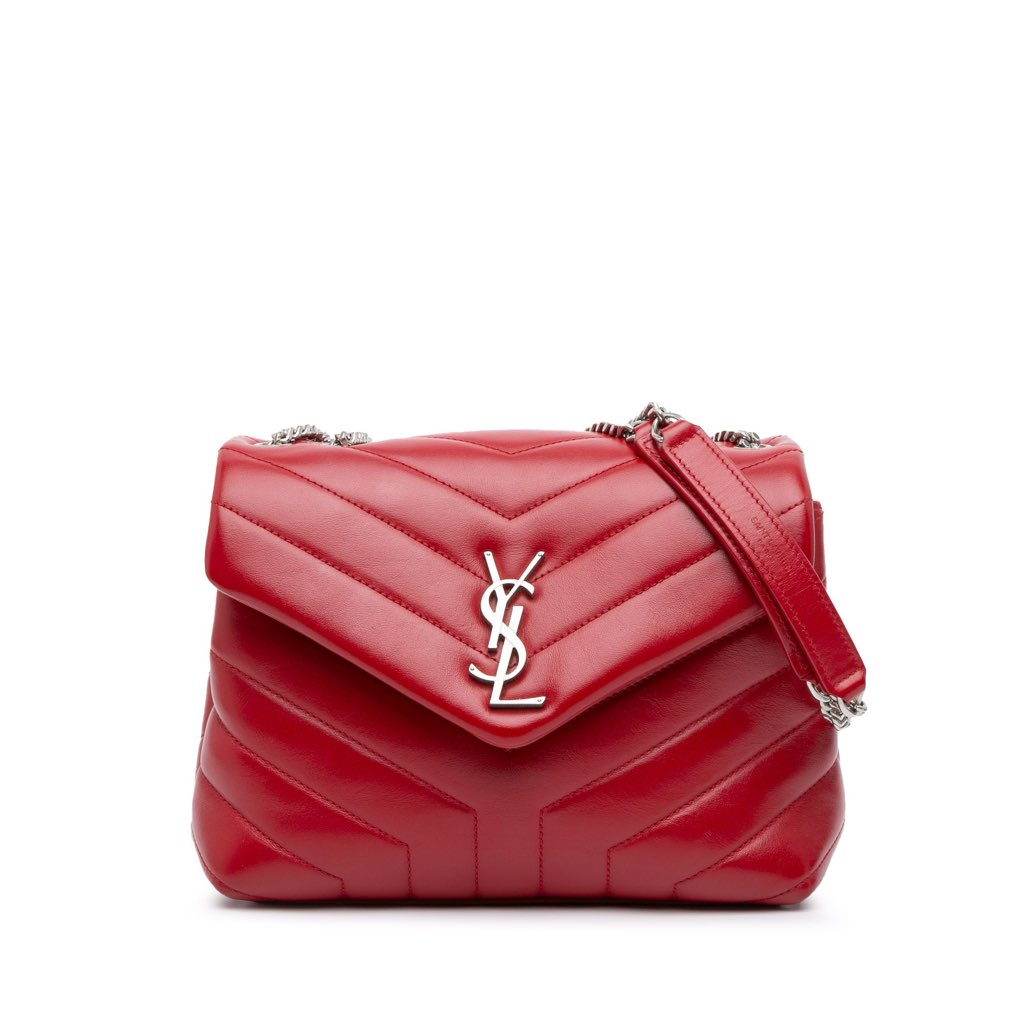 The Loulou features a quilted leather body, a curb chain shoulder strap, a front flap with magnetic snap closure, and interior zip and slip pockets.