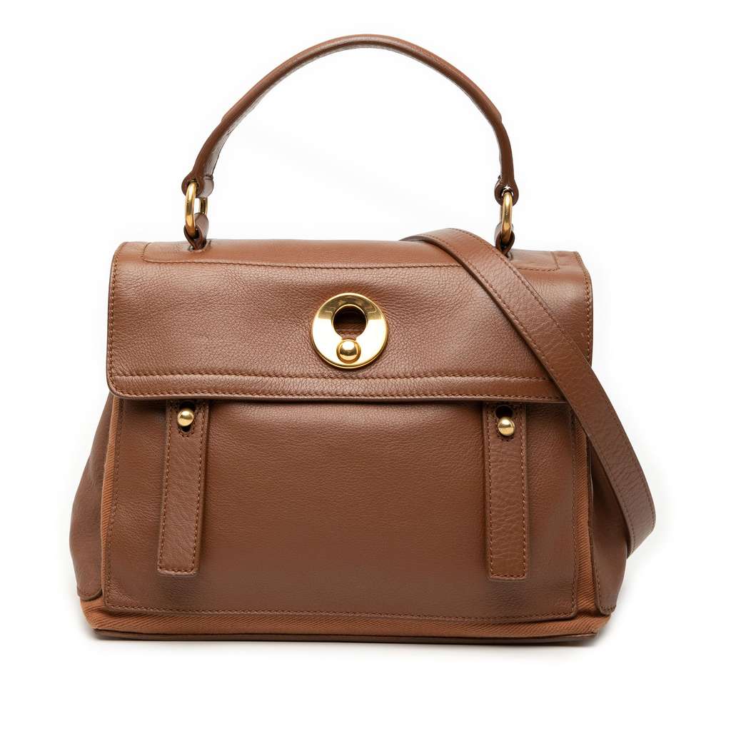 The Muse Two satchel features a leather body with canvas trim, a flat leather top handle, a flat strap, a front flap with a hook closure, an exterior back pocket, and an interior zip compartment.